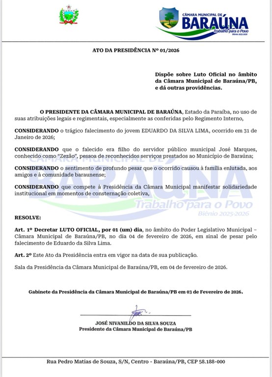 O Luto Oficial foi decretado por um dia em sinal de pesar pelo falecimento de Eduardo da Silva Lima, ocorrido em 31 de janeiro de 2026.